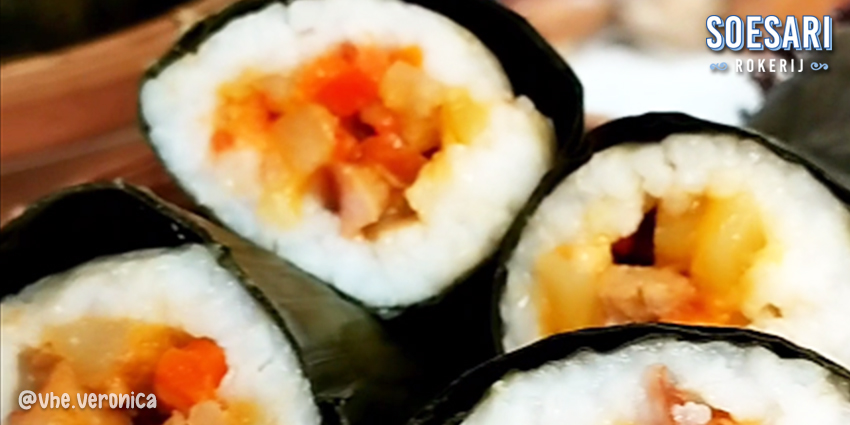 Kemudian, siapkan daun pisang dan susun nasi bersama isiannya. Gulung dan rekatkan dengan tusuk gigi