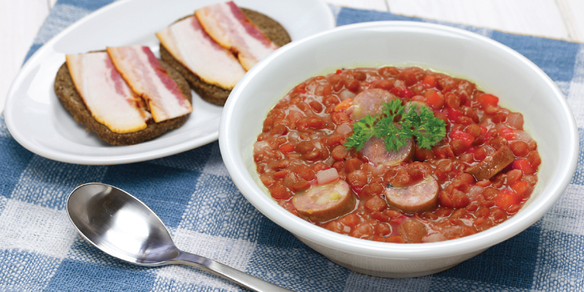 Keluarkan daun salam dan cengkeh lalu tambahkan merica dan garam. Keluarkan sosis dari sup dan potong sosis sebelum disajikan.