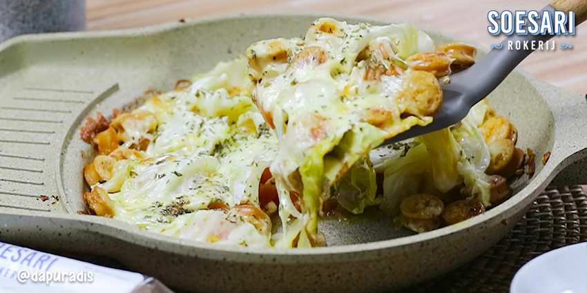 Cheesy Cabbage Sausage Skillet siap disajikan.