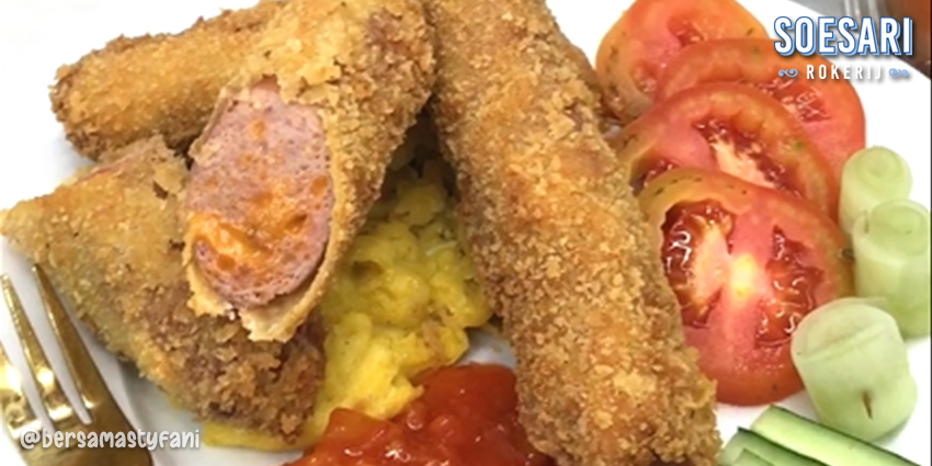 Kemudian, siapkan tepung roti dan balur secara merata Sosis Sapi Keju