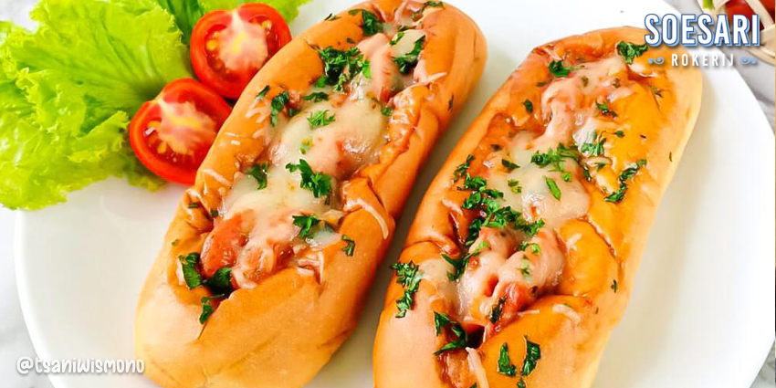 Taburkan garlic bread dengan sosis, tambahkan topping dengan keju mozzarella dan parsley. Kemudian panggang dalam suhu 180°C selama 5 menit sampai keju meleleh