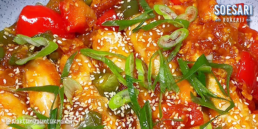 3. Panaskan pan anti lengket, beri sedikit minyak lalu masukkan Sosis Ayam Keju Soesari Rokerij, potongan bawang bombay, paprika merah, paprika hijau, serta campuran saus yang sudah disiapkan