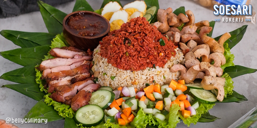 - Susun nasi goreng merah dan putih menjadi nasi tumpeng