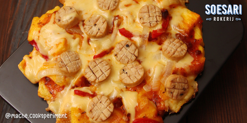Oles roti dengan saus spaghetti, beri taburan keju dan kemudian disusul dengan topping bombay dan paprika, lalu beri potongan sosis.