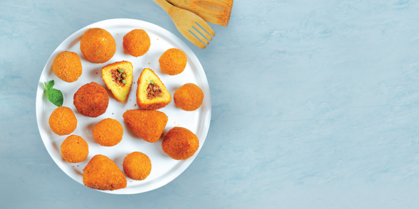 Combine risotto, eggs, remaining cheese, and ½ cup breadcrumbs; mix well. Shape mixture into balls the size of a golf ball. Fill center of each ball with sausage.