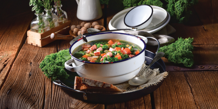 Bring to a boil over medium heat and reduce heat to low. Add kale and simmer 20-30 minutes, or until ready to serve.