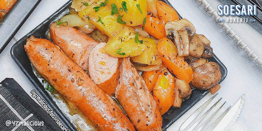 3. Keluarkan dari oven, balik sosisnya lalu oven kembali selama 25 menit.