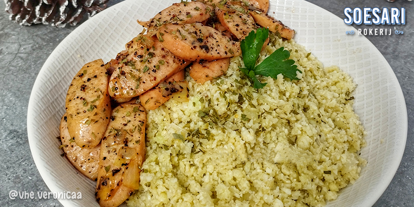 Siapkan piring tata cauliflower rice kemudian beri sosis lada hitam diatasnya, beri taburan parsley