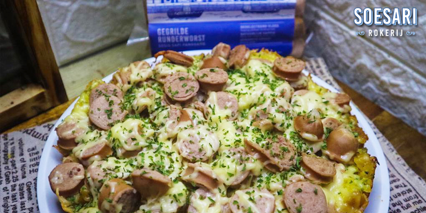 Tambahkan Keju dan Sosis Sapi Panggang, lalu masak di api kecil selama 15 – 20 menit