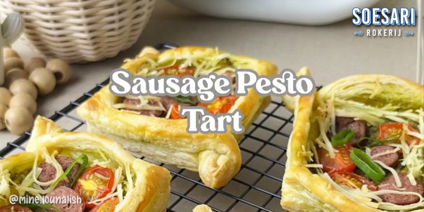 Keluarkan Puff Pastry yang sudah dipanggang dan tambahkan isian berupa Bumbu Pesto, Sosis Sapi Panggang Soesari Rokerij, Tomat Cherry Organik Third Day, dan juga Keju Parut