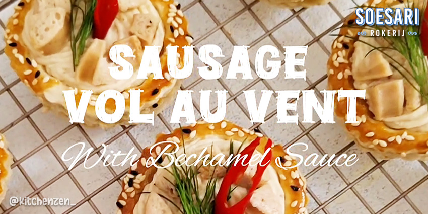 Isi tumisan sosis ke dalam vol au vent, beri bechamel sauce, beri potongan sosis di atasnya, hias dengan irisan cabe dan daun dill
