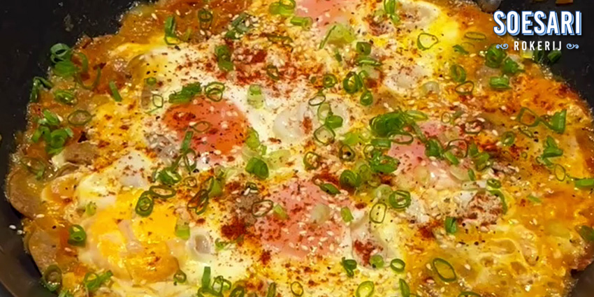 7. Pecahkan 4 butir telur, tuangkan di tengahnya, lalu tutup wajan sampai matang