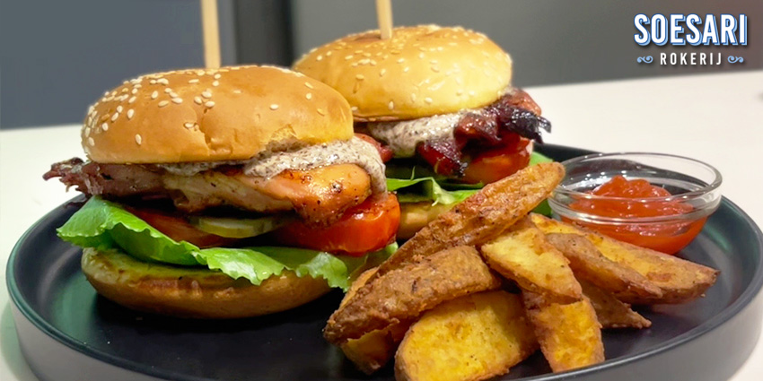 8. Sajikan dengan kentang goreng wedges, dan Smoked Chicken Truffle Burger siap dihidangkan