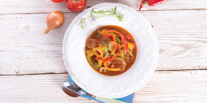 In the same skillet over medium heat, combine the green bell pepper, red bell pepper, onion and butter or margarine and saute for 10 minutes, or until all vegetables are tender. Add the sausage and stir together well. Season with salt and pepper to taste.