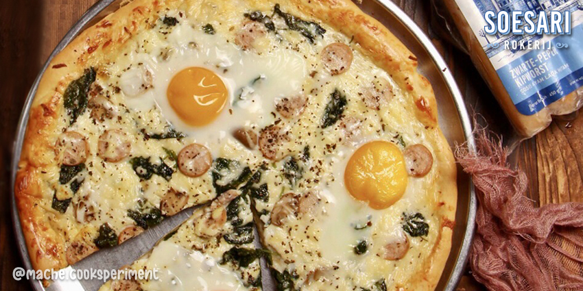 - Beri saus keju dan ratakan, beri topping, taburan keju quickmelt atau mozarella lalu beri 3 telur utuh diatasnya, panggang pizza di oven yang sudah dipanaskan dulu, oven selama 15 - 20 menit dengan suhu 180 DC. Api atas bawah (sesuaikan dengan oven masing-masing dan ketebalan adonan).